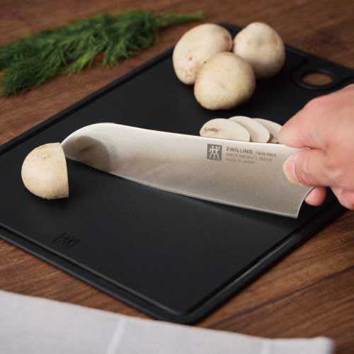 柔軟性に富み、復元力も高いので、木製・プラスチック製のカッティングボードと比較し、圧倒的に表面にキズがつきにくいのが特徴。