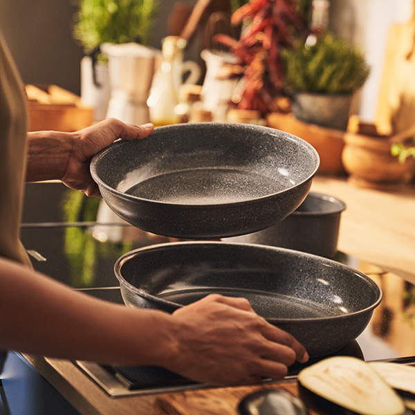 さらに、底厚設計のため、熱をしっかり蓄えてムラなく伝えることで、外は香ばしく、中はふっくらとした理想の焼き上がりに。御影石を彷彿とさせる美しい表面は、食卓にそのまま出しても映えるデザイン。お料理中も調理後の洗浄も、使い始めの気持ちいいツルッと感をキープします。