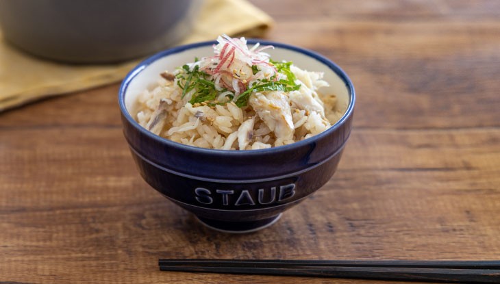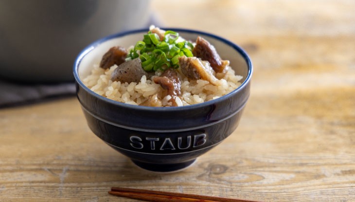 - 鍋に米、②の煮汁に水(分量外)を加えて総量600ccにしたものを入れ、蓋を少しずらした状態で中火で加熱する。沸騰したら蓋をして中火のまま2-3分、その後、極弱火にして13分加熱、火をとめて12分蒸らす。