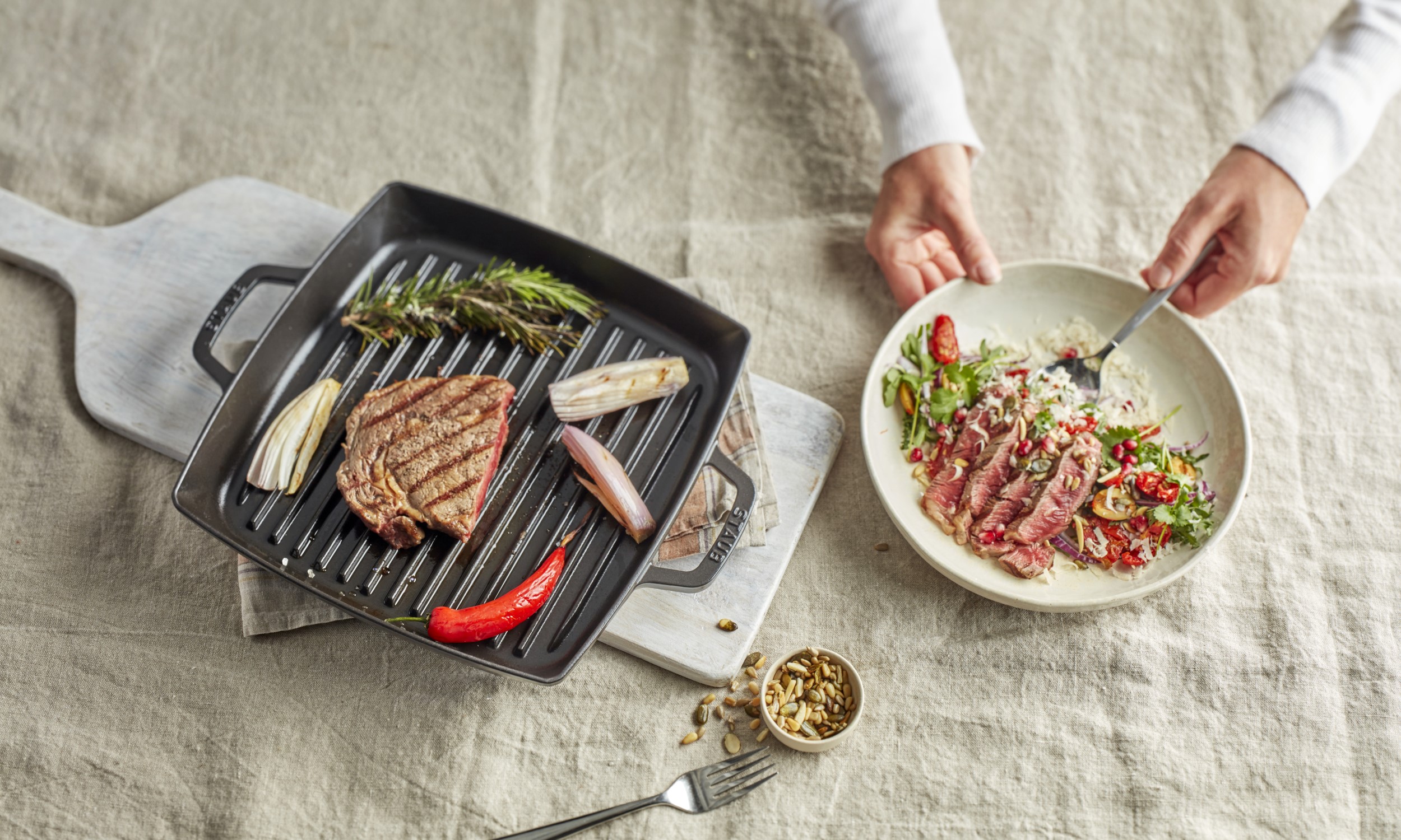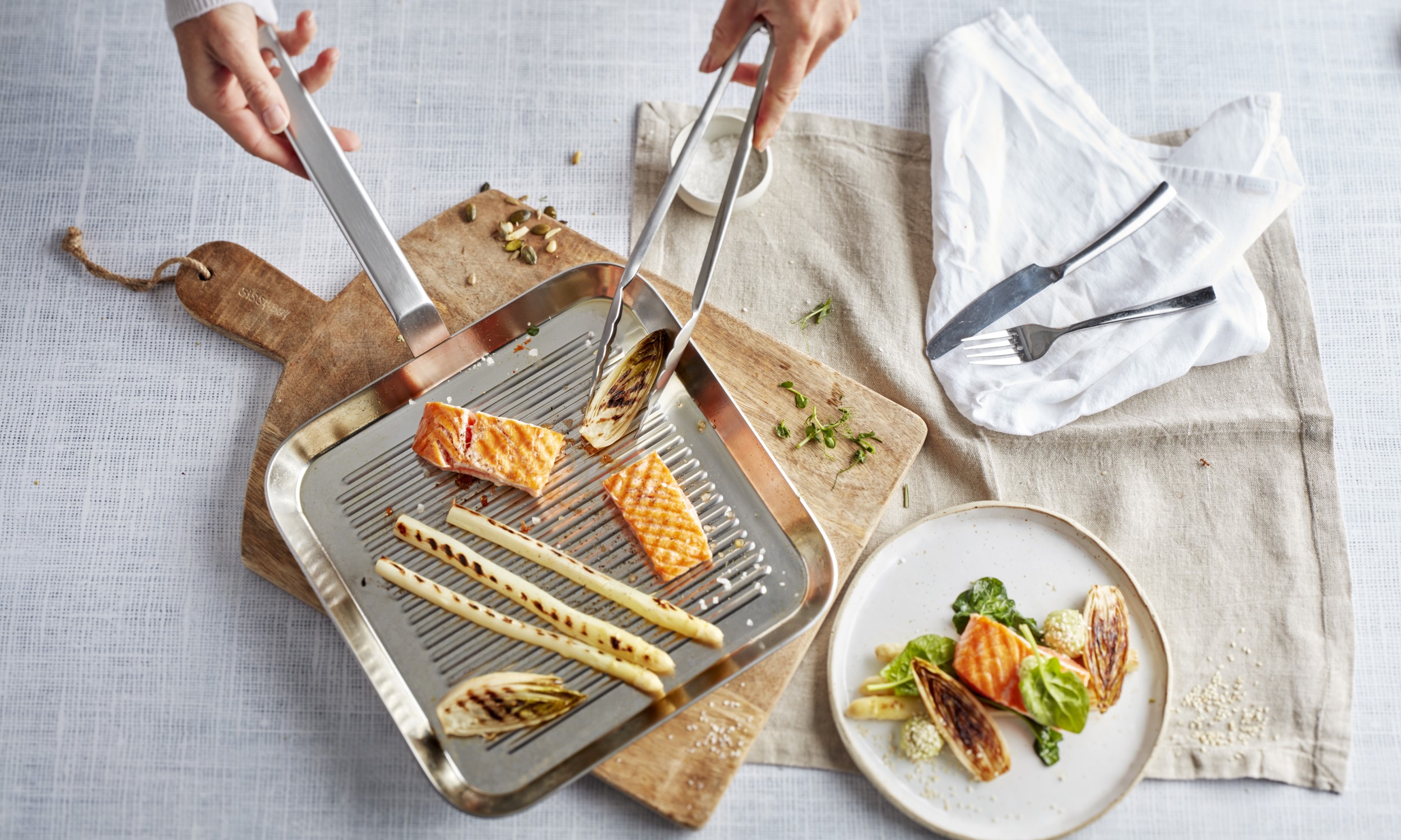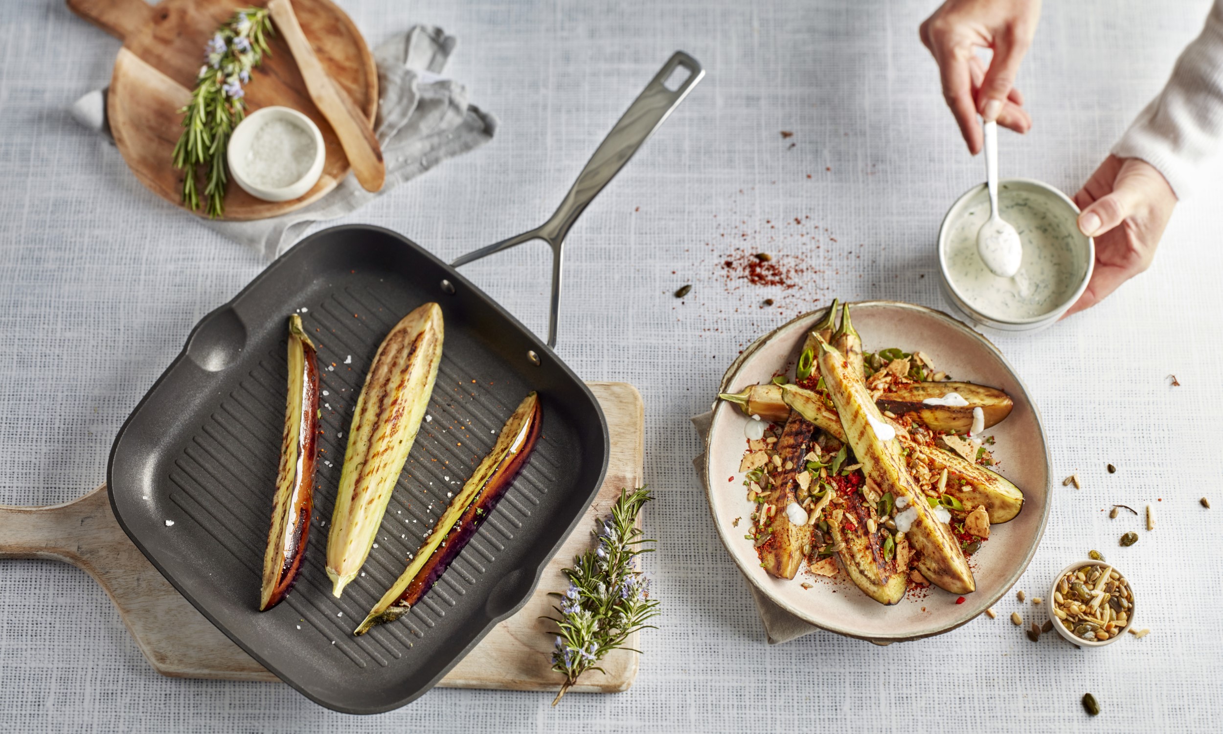 - Grelhe os pimentos em fogo alto numa frigideira grelhadora. Isso facilitará a remoção da pele. Em seguida, remova as sementes. Pincele os pimentos pontiagudos descascados com azeite e grelhe novamente até que as marcas da grelha fiquem visíveis. Tempere com sal e pimenta.