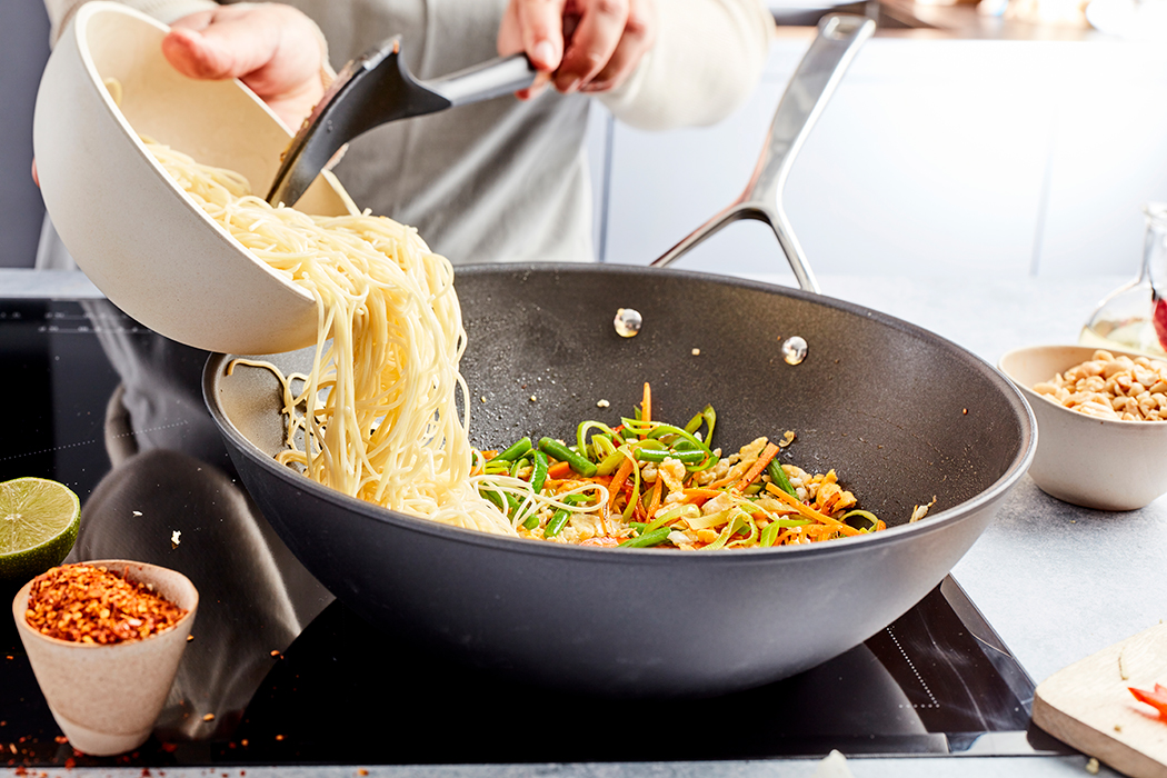 - Adicione as cenouras e salteie por 1 minuto. Adicione os cogumelos e salteie por mais 1 minuto. Incorpore as ervilhas tortas e os talos de pak choi e salteie brevemente, depois adicione a parte verde escura das folhas com os noodles escorridos. Salteie tudo no wok por mais 2-3 minutos.