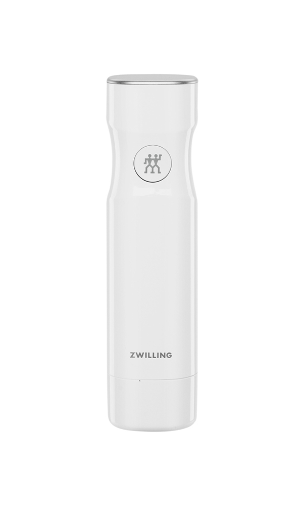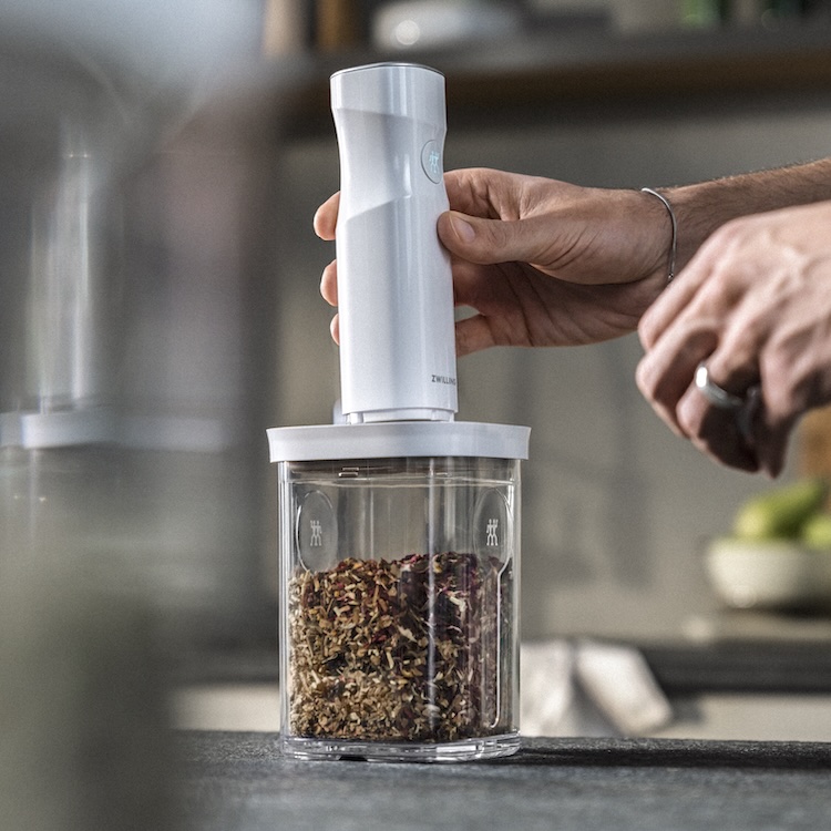 Com o pressionar de um botão: Fresco. A bomba de vácuo FRESH & SAVE. Não há necessidade de selos a vácuo incómodos ou que ocupam muito espaço, nem de se preocupar com selos a vácuo manuais ou mangueiras: basta utilizar a elegante bomba de vácuo ZWILLING e deixá-la fazer o trabalho por si! 1º: coloque a bomba na válvula da tampa dos recipientes e sacos do novo sistema de armazenamento a vácuo. 2º: Pressione o botão e a bomba extrairá o ar dos sacos ou recipientes de vidro e plástico em apenas alguns segundos. 3º: A bomba pára automaticamente quando o vácuo correto é alcançado. Os seus alimentos e refeições selados a vácuo permanecem frescos até cinco vezes mais quando comparados com os métodos convencionais de armazenamento. Depois, basta colocar a bomba de vácuo de volta na prateleira ou escondê-la na gaveta. Mas quer realmente fazer isso? O design de alta qualidade da bomba por Mattheo Thun torna-a um atraente chamariz na sua cozinha. Psst…! A propósito, a bomba de vácuo inteligente é muito silenciosa. Às vezes, tudo se encaixa perfeitamente. Descubra ZWILLING FRESH & SAVE.