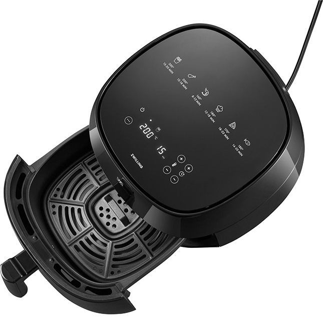 3...2...1... aproveite! A fritadeira de ar quente ZWILLING cria pratos salgados e doces em pouco tempo. Batatas fritas crocantes, pizza, muffins e muito mais podem ser facilmente preparados. Pode fritar sem gordura ou óleo ou com apenas um pouco de gordura, mas também cozinhar e cozer. No ecrã tátil LED, pode selecionar seis programas automáticos: batatas fritas, frango, camarão, peixe, pizza e bolo. No entanto, a temperatura e o tempo também podem ser regulados individualmente. O livro de receitas incluído fornece ideias mais deliciosas que pode experimentar imediatamente. Depois de decorrido o tempo de cozedura selecionado, soa um sinal e a fritadeira de ar quente termina o processo de cozedura automaticamente. Com uma capacidade de 4 litros, terá espaço suficiente no cesto mesmo para porções maiores. O cesto e a grelha são seguros para a máquina de lavar loiça. Com a fritadeira, não há gordura residual para eliminar, tornando-a especialmente prática para o uso diário.