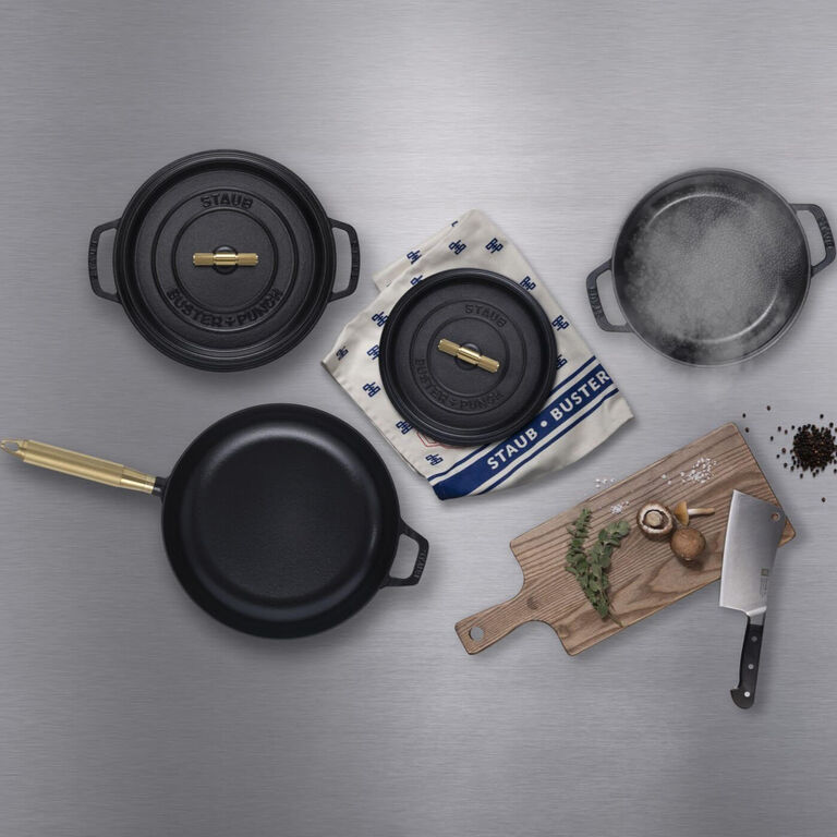 Samarbetet mellan STAUB och Buster + Punch är ett spännande möte mellan franskt kulinariskt arv och Londons metallmästare. STAUBs stekpanna och cocotte i gjutjärn förhöjs av Buster + Punchs signaturdesign – de lättrade handtagen – som förkroppsligar Londons energi och attityd på ditt bord.