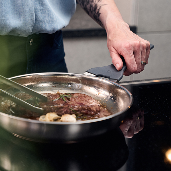 Enastående prestanda. Utmärkt hantering: Med ZWILLING Simplify-stekpannan upplever du stekning på en ny nivå. Den obelagda insidan av rostfritt stål är idealisk för att bryna kött. Eftersom stekpannan är reptålig kan du även använda dina köksredskap av metall. Dessutom har den vår SIGMA Classic-sandwichbotten med idealisk värmefördelning för effektivare stekning vid låga temperaturer. Och för vara lätthanterlig är den försedd med vårt Stay-Cool-handtag. Ergonomiskt utformat och överdraget med silikon. Ligger behagligt och alltid svalt i handen vid stekning. Och tack vare handtagets breda form kan du lägga dina matlagningsredskap på det. På så sätt håller du din arbetsyta ren.