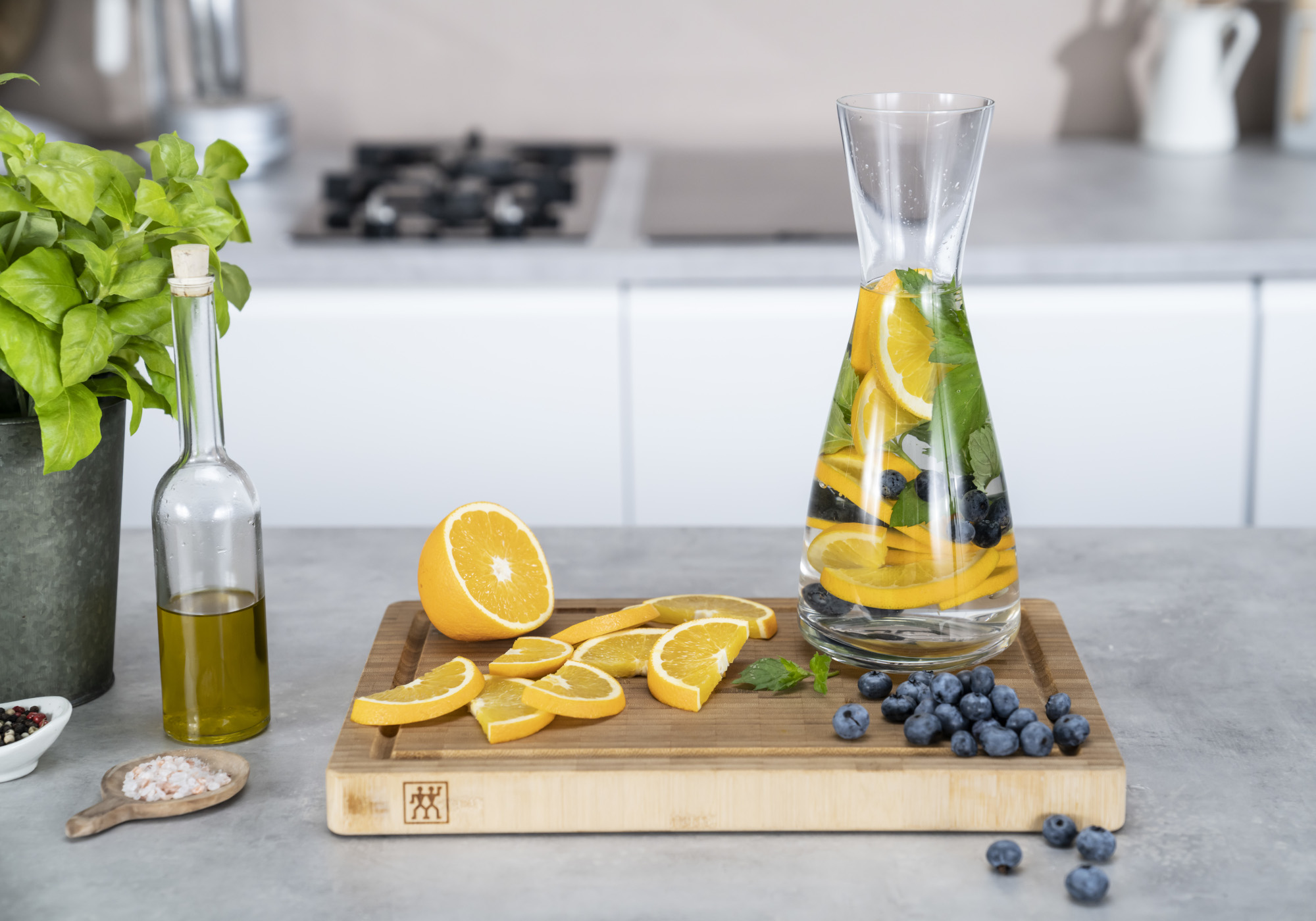 - Bu sırada şeftali ve nektarinleri yıkayın, ortadan ikiye bölün, çekirdeklerini çıkarın. Buz, şeftali ve nektarin küplerini bir sürahiye koyun, örn. ZWILLING PRÉDICAT.