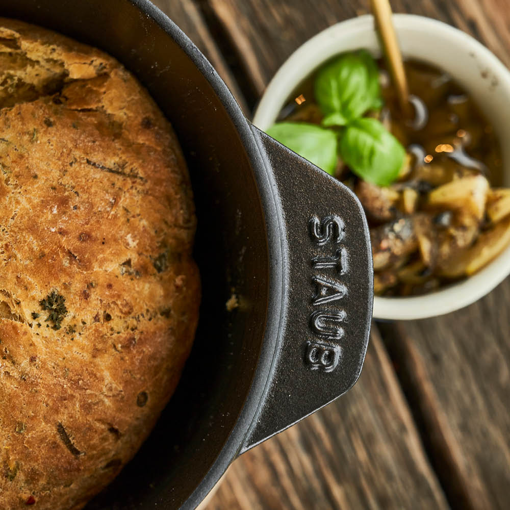 Mit ihrem flachen Deckel lässt sich die Cocotte von STAUB fest verschließen. Im Inneren sorgt die Chistera-Drop-Structure für eine effektivere Flüssigkeitsverteilung als bei herkömmlichen Deckeln.