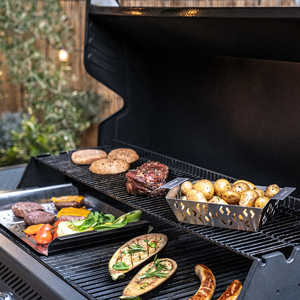 Use it to cook chopped vegetables such as courgette or aubergine, small pieces of meat like chicken, or even fish. The special perforation of the basket ensures that your grilled food is protected from direct flames or embers. This also benefits your results, because you can simply concentrate on everything else that is on the grill without anything burning or sticking. And you get roasted flavours as an added bonus!