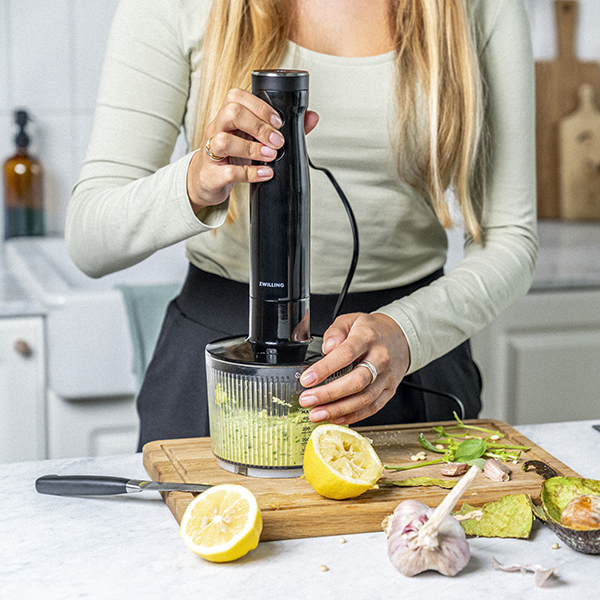 Full power, compact dimensions and exactly the versatility you need to excel in the kitchen: with the ZWILLING ENFINIGY Hand Blender you own a real all-rounder. Which can now do even more thanks to the chopper attachment. Use the power for the most intensive work in the kitchen and chop even hard foods such as nuts and chocolate evenly and quickly. Or make delicious pestos and creams. It’a all no problem for the high-quality ZWILLING stainless steel blade. The blade is particularly close to the bottom. As a result, it takes all the food with it with every turn: no residue is left. This way you can create completely new masterpieces in your kitchen. The high-quality container made of plastic holds up to 400 ml. It is very robust and easy to clean: after use, you can put it in the dishwasher, just like the blade. The rest can be cleaned effortlessly by hand.