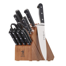 Prep work is easy with the Henckels International CLASSIC 16-pc Knife Block Set. Experience confidence with each cut thanks to the fine-edge precision blades that are honed for long-lasting sharpness. The 8" Chef's Knife, a kitchen workhorse, is ideal for chopping herbs and dicing onions while the 5" Serrated Utility Knife cleanly slices through tomatoes. Perfectly peel apples with the small 4" Paring Knife.