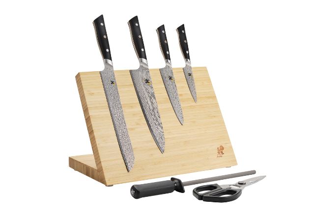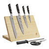 This 7-piece knife block set features an essential set of ultra-sharp knives for everyday food prep. Designed to elevate everyday knife storage, the magnetic knife block boasts an elegant, angled silhouette for displaying your knives on your countertop. The sleek, magnetic ash wood board keeps knives securely fastened, thanks to the extra-strong magnet system hidden inside the wood.