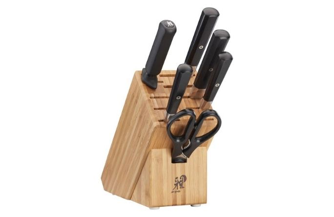 This 7-piece set features all the essential knives for the kitchen. From the all-rounder 8-inch chef’s knife for slicing meat, dicing onions, and mincing garlic, to the 3.5-inch paring knife perfect for peeling vegetables and segmenting fruit. This set is completed with a handsome knife block that keeps your knives within reach on your countertop.