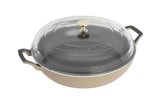 The STAUB 3.5-quart braiser with glass lid is the perfect cookware for one-pot dinners, slow-cooked braises, and simmered soups. The heavyweight, domed glass lid locks in moisture and accommodates large cuts of meat. STAUB cast iron possesses exceptional heat-retention qualities, so the pot heats evenly throughout. The textured black matte enamel interior ensures exceptional browning and requires no seasoning.