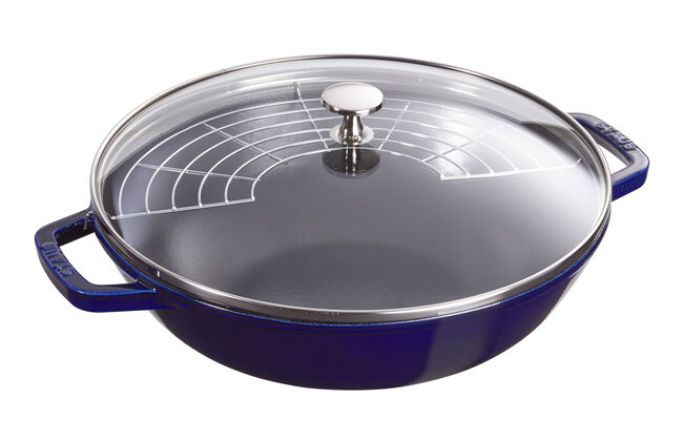 Rated 5 out of 5 by from Truly a Perfect Pan. From Stove to Table. This is my go to wedding gift. In this Dark Blue color too. It is a stunning deep blue. But better than the color is the usefulness of the pan itself. It's so easy to make stews, curries and pasta sauce in this wok shaped pan. Combine ingredients and simmer until you bring it to the table for the family to enjoy together. The heavy duty cast iron keeps food warm while you enjoy. I also use mine for deep frying. Tempura. Fish fry. French fries. It comes with the draining rack. So easy to work with, and easy to clean afterwards.