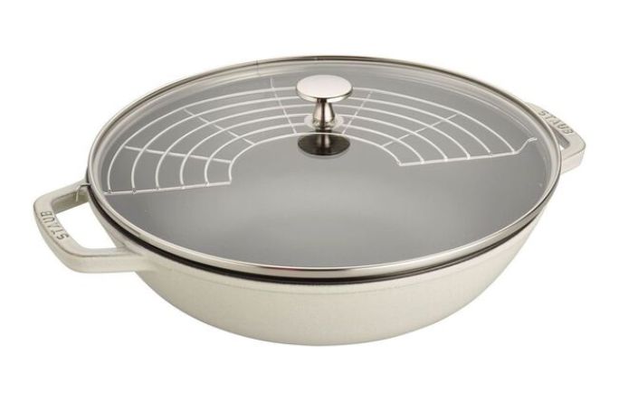 Rated 5 out of 5 by from If you ever cook fora crowd, this is your wok. All the great features, just sized up to handle volume when you need it.The construction and thoughtfulness in Staub woks is unquestioned. The wide sloping sides where you can posit some ingredients while you cook others is quintessential. The lid is a must have, it allows the few minutes of steaming that gets vegetables crisp tender, and the long minutes of simmering that gets meats braised through. The stainless steel draining rack makes blanching and deep frying so much easier. Finally, the two handles on either side, and the beautiful enamel finish, even this clean matte black, makes it convenient to bring right to the table for everyone to share. Well done!