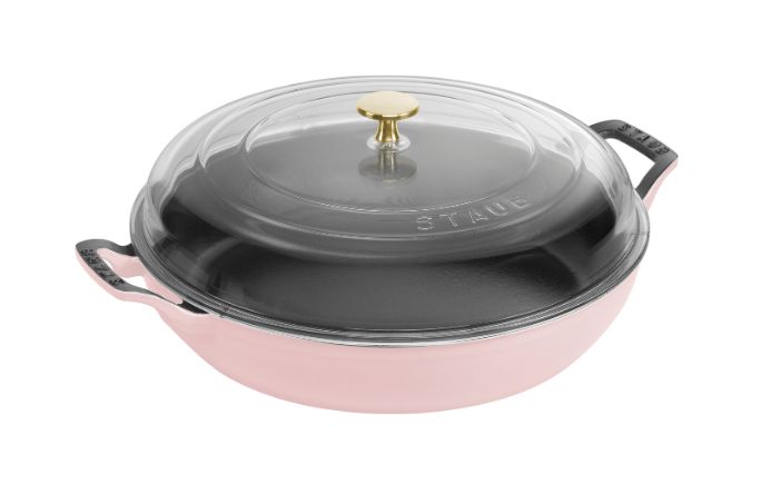 The STAUB 3.5-quart braiser with glass lid is the perfect cookware for one-pot dinners, slow-cooked braises, and simmered soups. The heavyweight, domed glass lid locks in moisture and accommodates large cuts of meat. STAUB cast iron possesses exceptional heat-retention qualities, so the pot heats evenly throughout. The textured black matte enamel interior ensures exceptional browning and requires no seasoning.