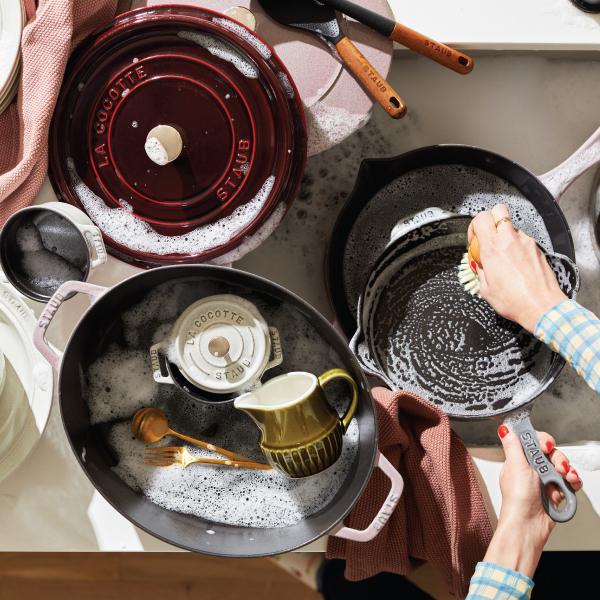 Unlike traditional cast iron, STAUB enameled cast iron does not require seasoning and can be cleaned with soap and water by hand or in the dishwasher.