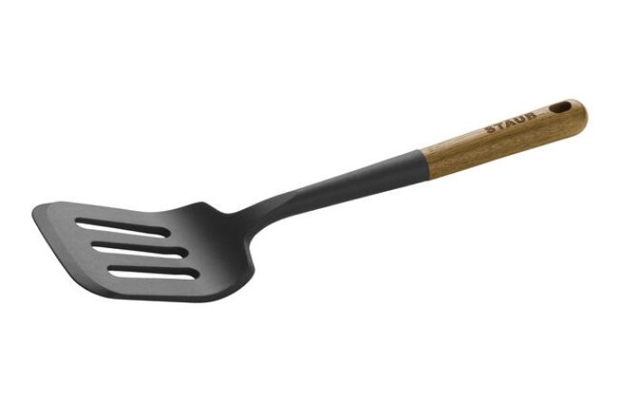 Sturdy silicone slotted turner!This Staub Serving Turner is excellent picking up and turning solid food, which makes it easier when cooking. Slotted turner will allow to drain liquid and oil upon picking up solid food, works really well for frying and sauteing tools. The turner is ideally suited for all Zwilling non-stick cookware such as CFX clad, Motion, Ballarini, Spirit and Alu Pro including ceramic coated. Can be use for stainless steel cookware as well as cast iron and a ceramic bakeware helper. This turner is slightly angled for comfort, a convenient and safe feature. This Staub turner is made from long-lasting black matte silicone and eco-friendly Acacia wood. Handwashing is highly recommended.