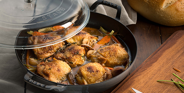 Staub enameled cast iron cookware is the choice of the world’s best chefs. With exceptional durability, it is perfect for day-to-day use in both gourmet home kitchens and prestigious restaurants around the world. Built to last a lifetime, these heirloom pieces can be passed from generation to generation. The Staub cocotte is unsurpassed for slow-cooking meats and vegetables to tender perfection, and for simmering hearty stews and soups. Cast iron possesses exceptional heat-retaining qualities, so the pot heats evenly throughout. The innovative lid features tiny spikes on the interior that continually release condensed liquid back onto the food, yielding moist, flavorful results. This pot makes a handsome serving vessel at the table. Staub’s special matte black enamel interior and self-basting spiked lid guarantee perfect browning and braising for flavor-enhanced food. With their exquisite enamel finish, each piece transitions beautifully from the kitchen to the table. From comfort food to sumptuous suppers, every dish is special when served in Staub.