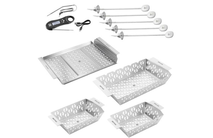 Set includes: 5-piece skewer set, 1 grill topper, 1 medium grill basket, 2 small grill baskets, digital thermometer