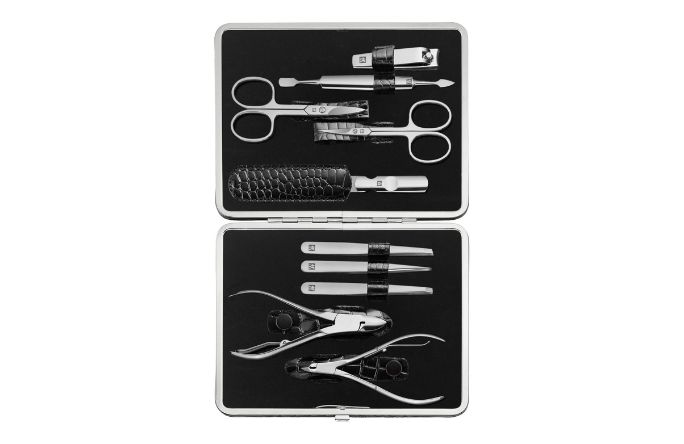 The functional 10-piece nail care set is ideal for comprehensive nail care and particularly practical for safe storage of beauty tools at home or on the go. The black genuine leather case in croco design with metal frame and velvet cover on the inside contains a pair of nail clippers, a cuticle pusher and cleaner, nail scissors, cuticle scissors, a sapphire nail file, slanted tweezers, straight tweezers, pointed tweezers, nail nippers and cuticle nippers. The manufacturing of the instruments from stainless, polished steel guarantees hygienic cleaning as well as a long service life and ensures excellent functionality in an appealing design.