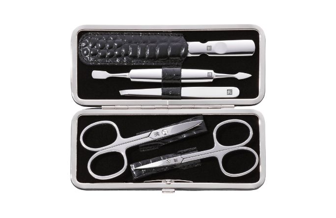 This functional 5-piece nail care set includes everything you need for beautiful, groomed nails. The velvet interior of the elegant black neat’s leather case with metal frame an croco design neatly and securely holds a pair of cuticle scissors, nail scissors, a cuticle pusher and cleaner, a sapphire nail file and slanted tweezers. ZWILLING Beauty products are made with polished stainless steel and deliver the functionality, longevity and corrosion resistance expected from ZWILLING.