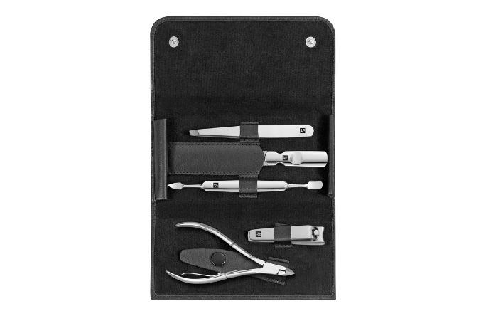This functional 5-piece nail care set includes everything you need for beautiful, groomed nails. The velvet interior of the elegant black neat’s leather case with snap fastener neatly and securely holds nail clippers, slanted tweezers, cuticle nippers, a cuticle pusher and cleaner, and a sapphire nail file. ZWILLING Beauty products are made with polished stainless steel and deliver the functionality, longevity and corrosion resistance expected from ZWILLING.
