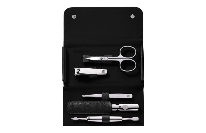 This functional 5-piece nail care set includes everything you need for beautiful, groomed nails. The velvet interior of the elegant black neat’s leather case with snap fastener neatly and securely holds nail and cuticle scissors, nail clippers, slanted tweezers, a cuticle pusher and cleaner, and a sapphire nail file. ZWILLING Beauty products are made with polished stainless steel and deliver the functionality, longevity and corrosion resistance expected from ZWILLING.