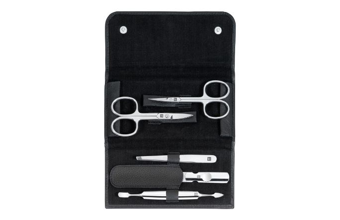 This functional 5-piece nail care set includes everything you need for beautiful, groomed nails. The velvet interior of the elegant black neat’s leather case with snap fastener neatly and securely holds a pair of cuticle scissors, nail scissors, a cuticle pusher and cleaner, a sapphire nail file and a slanted tweezers. ZWILLING Beauty products are made with polished stainless steel and deliver the functionality, longevity and corrosion resistance expected from ZWILLING.