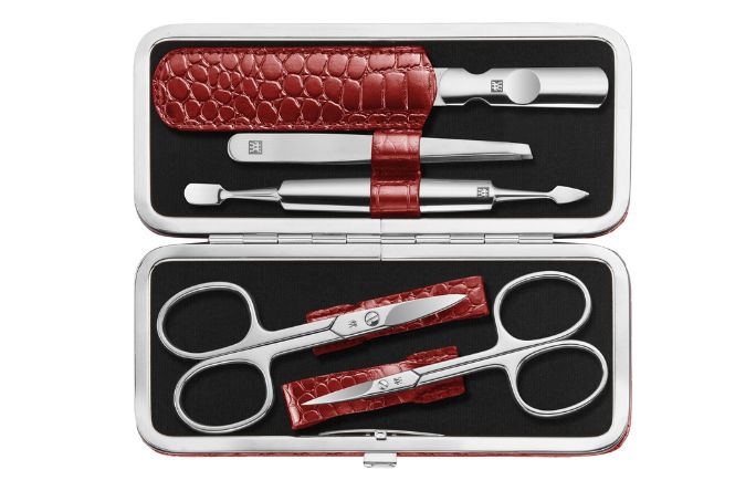 This functional 5-piece nail care set includes everything you need for beautiful, groomed nails. The velvet interior of the elegant red neat’s leather case with metal frame and croco design neatly and securely holds a pair of cuticle scissors, nail scissors, a cuticle pusher and cleaner, a sapphire nail file and a slanted tweezers. ZWILLING Beauty products are made with polished stainless steel and deliver the functionality, longevity and corrosion resistance expected from ZWILLING.