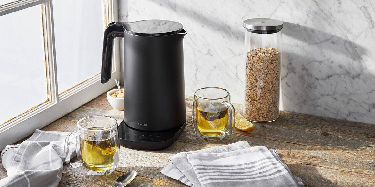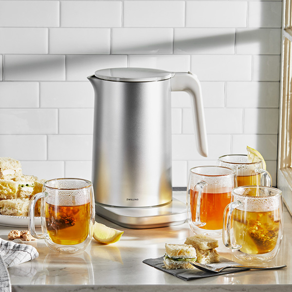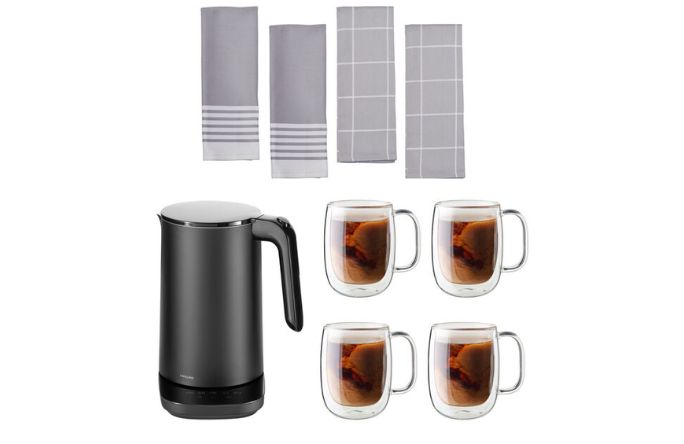 The Enfinigy Kettle Pro Set in matte black features everything you need to pour the perfect cup of your favorite beverage. With the Kettle Pro you can achieve the ideal water temperature for coffee, tea, baby bottles, and more at just the touch of a button. After you’ve poured your cup, the Sorrento Coffee Glass Mugs maintain their toasty temperature while remaining cool to the touch on the outside. And the ultra-absorbent ZWILLING Care Towels keep your kitchen clean when tea-time is over. They mop up spills and help you dry freshly washed dishes in no time.
