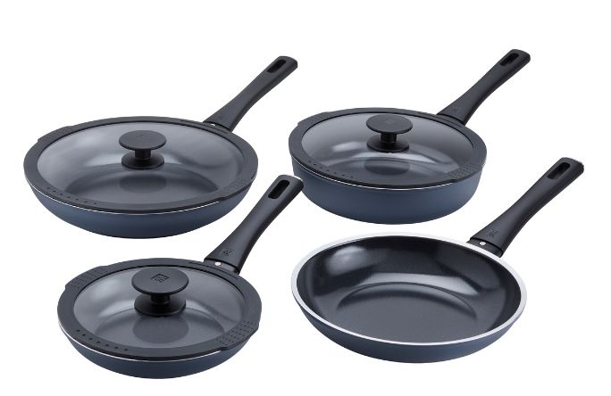 Set includes: 8-inch fry pan with lid, 9.5-inch fry pan with lid (lid also fits 2.6-quart sauté pan), 11-inch fry pan with lid, 2.6-quart sauté pan