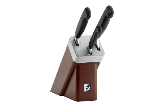 The self-sharpening slots with built-in honing mechanisms automatically sharpen to the perfect angle each time a knife is removed or replaced. The knives are stored in a compact, 3-slot knife block.
