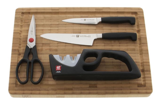 This 5-piece cutting board set features everything you need to set your kitchen up right. This set includes the 5.5-inch prep knife for precise results in-hand and on a cutting board, and the 4-inch paring knife for smaller cutting jobs like peeling vegetables and segmenting fruit. This set is complete with kitchen shears and a sturdy bamboo cutting board.