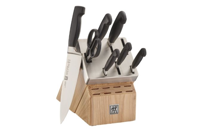 The blocks feature self-sharpening slots that ensure your fine edge knives are always sharp. The other slots are for serrated knives, whose toothed blades never need sharpening