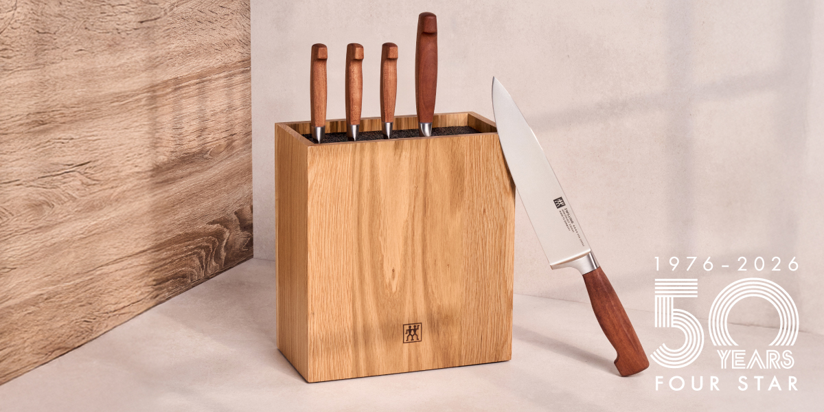 ZWILLING Four Star enters its next evolution with Four Star Wood. The limited-edition collection honors the exceptional performance and quality materials you've always trusted, now finished in FSC-certified Kotibe hardwood that's as beautiful to hold as it is to use.