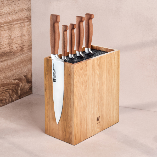 FSC-certified knife block with a bristle insert and magnets on short ends to keep your blades secure and within reach.