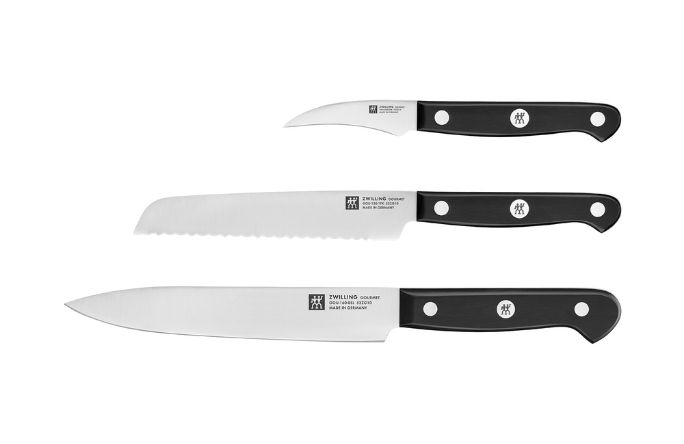 ZWILLING Gourmet is the go-to knife for home chefs eager for their everyday knife to be exceptional. Elevate your prep with this 3-piece knife set designed for precision cuts. The 2.75-inch bird's beak knife excels at intricate work like peeling, trimming, and shaping. The 5-inch serrated utility knife cleanly slices through everything from crusty loaves to delicate produce without tearing. And the 6-inch slicing knife delivers smooth, even cuts perfect for carving and slicing meats.