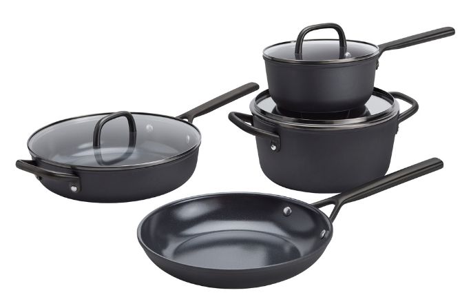 Set includes: 10-inch fry pan, 2-quart saucepan w/ lid, 3.9-quart saute pan w/ lid, 5-quart Dutch oven w/ lid, pan protectors