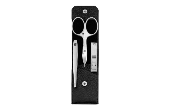This professional 3-piece Premium care set is the perfect compact nail care companion for travelling and when out and about. The interior of the robust black nappa leather case with snap fastener securely holds a pair of compact nail clippers, nail and cuticle scissors and slanted tweezers. The incredibly precise workmanship with matte satin-finished stainless steel and the perfect ergonomic design of the tools guarantee outstanding longevity and functionality in an attractive design.