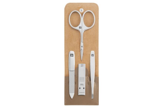 This professional 4-piece Premium nail care set is compact, space-saving and includes some of the most essential tools needed for everyday nail care. The velvet interior of this robust taupe neat’s leather case with a zip fastener neatly and securely holds a pair of compact nail clippers, cuticle scissors, a sapphire nail file and slanted tweezers. The incredibly precise workmanship with matte satin-finished stainless steel and the perfect ergonomic design of the tools guarantee outstanding longevity and functionality in an attractive design.