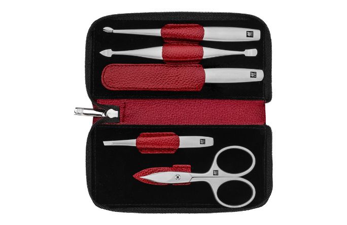 This professional 5-piece Premium nail care set includes the most essential items for effortless manicures and pedicures and quickly and precisely repairing nail damage. The velvet interior of this attractive red neat’s leather case with zip fastener includes nail and cuticle scissors, nail cuticle knife, a sapphire nail file, a cuticle pusher and cleaner, and slanted tweezers. The incredibly precise workmanship with matte satin-finished stainless steel and the perfect ergonomic design of the tools guarantee outstanding longevity and functionality in an attractive design.