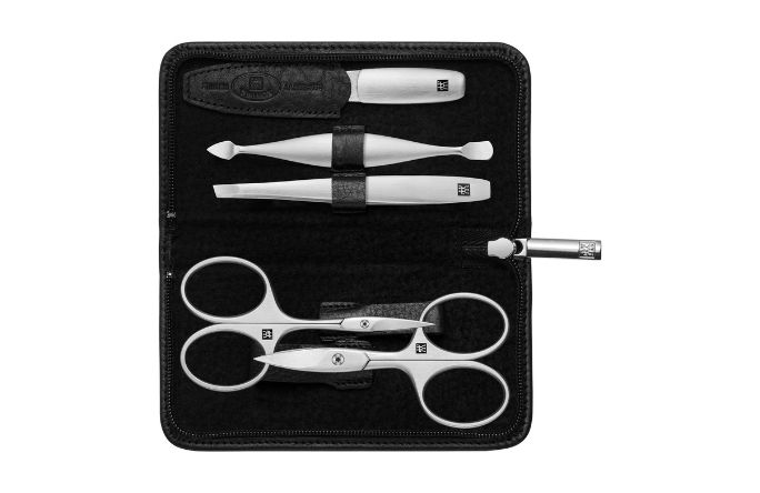 This professional 5-piece Premium nail care set is practical, space-saving and versatile for both travelling and everyday care. The velvet interior of the attractive black yak leather case with zip fastener securely holds a pair of nail scissors, cuticle scissors, a sapphire nail file, slanted tweezers and a small cuticle pusher and cleaner. The incredibly precise workmanship with matte satin-finished stainless steel and the perfect ergonomic design of the tools guarantee outstanding longevity and functionality in an attractive design.