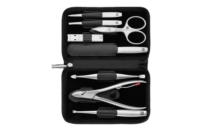 Includes compact nail clippers, nail and cuticle scissors, nail nippers, sapphire nail file, cuticle pusher and cleaner, V-shaped cuticle knife, slanted Tweezers and pointed tweezers