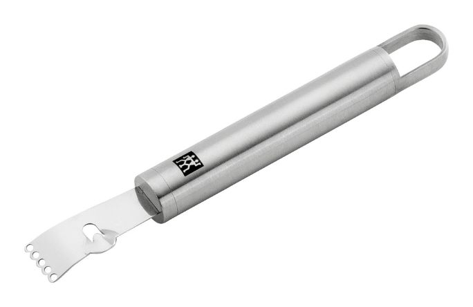 Fine strips to great effect. The ZWILLING Pro series lemon zester allows you to remove decorative strips from citrus fruits. The elegant kitchen gadget features two separate cutting sections for producing varying thicknesses of zest with a single lemon zester. Coarse zest serves as excellent decoration on desserts and cocktails while fine zest lends foods and drinks that certain extra something. At the same time, the bitter, white peel remains on the fruit. The lemon zester is easy to handle because the internationally known designers Matteo Thun and Antonio Rodriguez placed particular importance on perfect functionality during the development process. The shaped handle is not only elegant but doesn’t press uncomfortably into the palm even when used for extended periods. A decorative laser line accentuates the minimalistic look that distinguishes the entire Pro series and the use of stainless steel means that the lemon zester can be conveniently cleaned in the dishwasher.