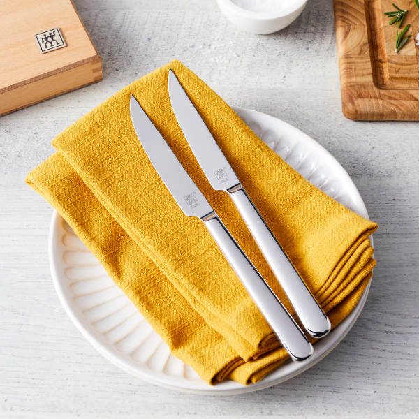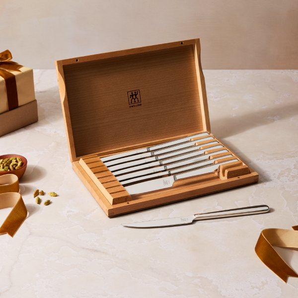 Slice through steak, pork chops, and chicken cutlets with ZWILLING Contemporary serrated steak knives. Housed in a wood presentation case, you can conveniently display your steak knives on the countertop or store them in any kitchen drawer.