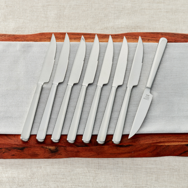 Elegant, stainless-steel steak knives in a handsome presentation case.
