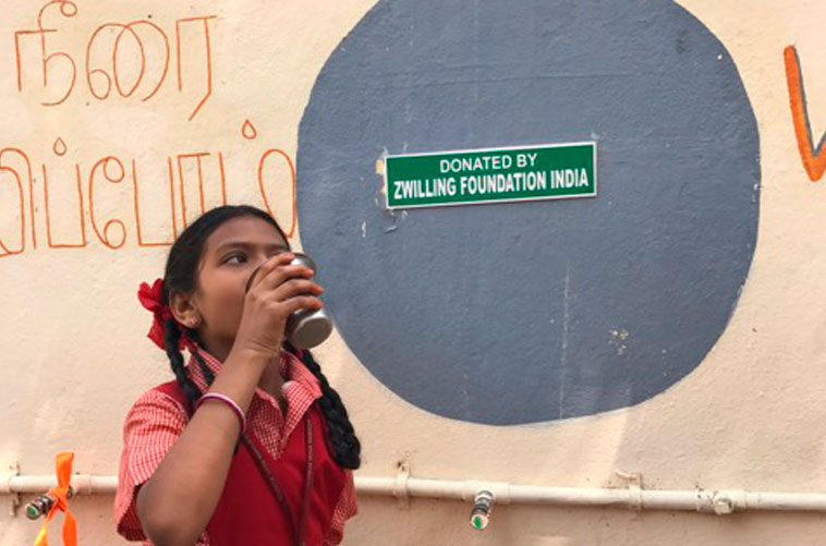 子どもたちは、汚染された水を飲むことで病気になることがよくあります。また、水道水を飲まないため、学校生活で脱水症状を起こすこともあります。ZWILLING基金は、2017年にインド・ニルヴァーナ高校に浄水ステーションを提供し、システムとフィルターのメンテナンスを行っています。